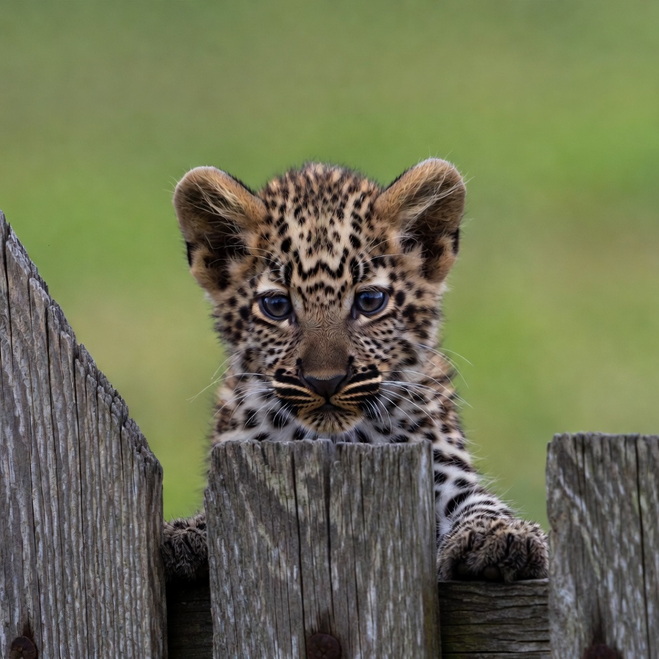animal, baby leopard, blue eyes, cub, fence, grass background, isolated background, leopard, paws, peeking, spotted fur, whiskers, wildlife, wooden fence, young animal, leopard cub