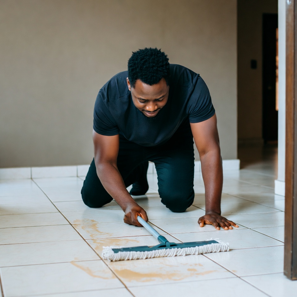 An African-American man with short curly black hair kneels on a tiled kitchen floor, mopping up a spill with a mop. He wears a black t-shirt and black pants, focusing intently on cleaning the wet puddle. The setting is an indoor room with beige walls and a door nearby.