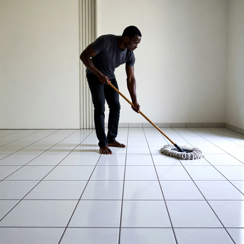 African-American, barefoot, bent over, black pants, bright room, cleaning, empty room, floor, gray t-shirt, house cleaning, household chores, indoor, janitor, male, mop, mopping, string mop, white tiles, wooden handle, man