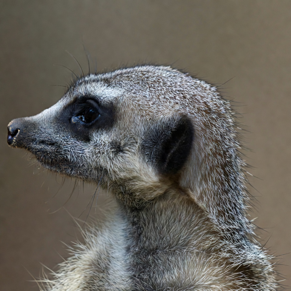 alert, animal, beige background, brown fur, cute animal, detailed fur, erect ears, furry, gray fur, isolated background, large eyes, mammal, meerkat face, portrait, profile view, side view, small snout, standing, wildlife, meerkat