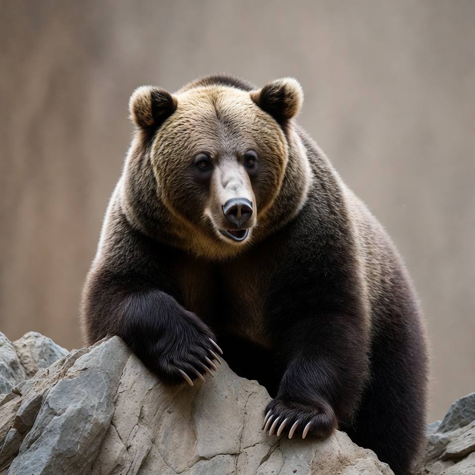 A large grizzly bear with brown fur sits on a gray rock. It faces forward with its mouth slightly open and paws resting on the stone. The background is a blurred neutral tone.