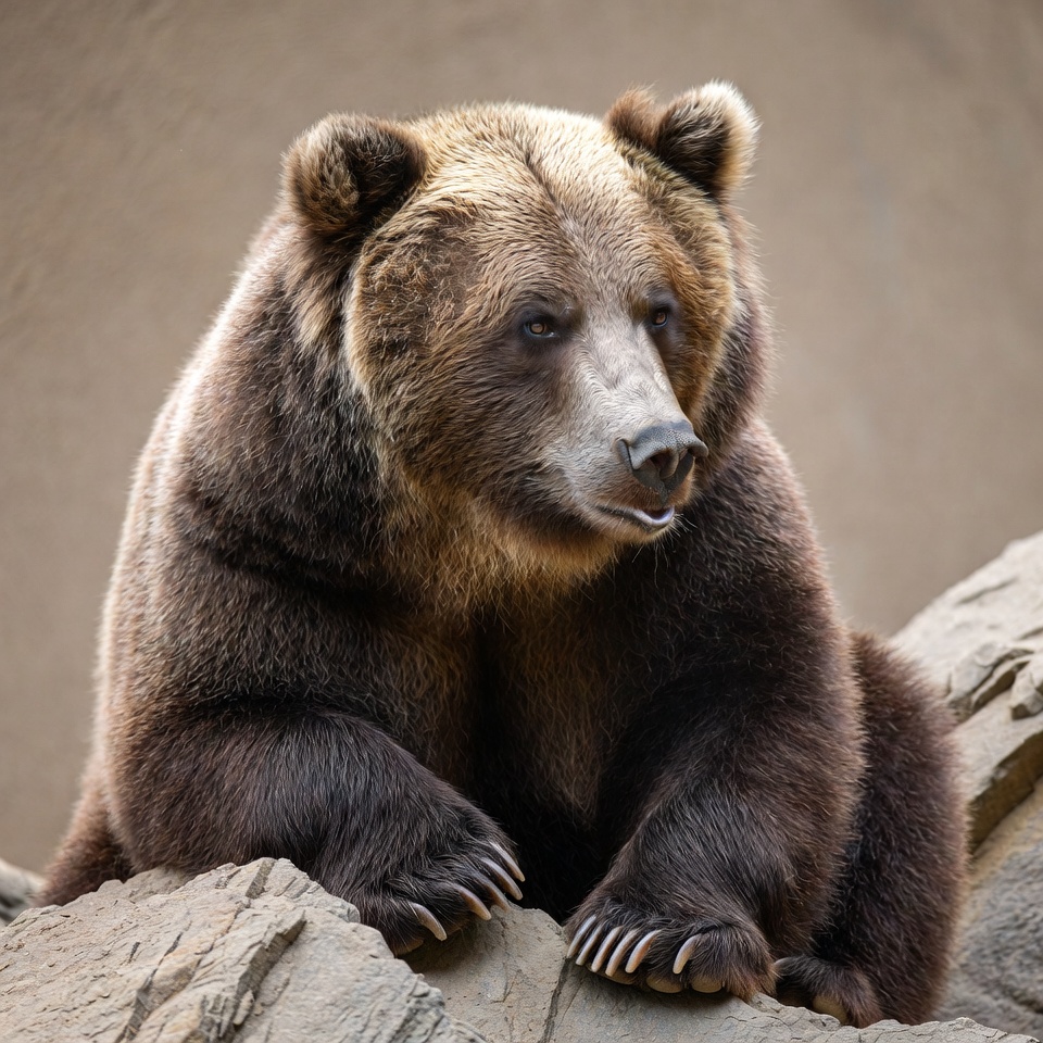 A large grizzly bear with thick brown fur sits on a rocky surface. It faces slightly to the side with a serious expression, paws resting in front. The background is a neutral beige wall.
