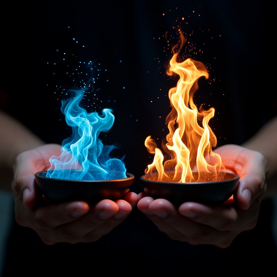 A pair of hands holds two small black bowls on a dark background. The left bowl contains swirling blue magical fire with sparkling effects, while the right bowl holds bright orange realistic flames. The contrasting fires are captured in close-up with dramatic lighting.