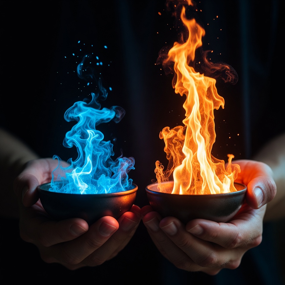 Hands holding fire and ice bowls