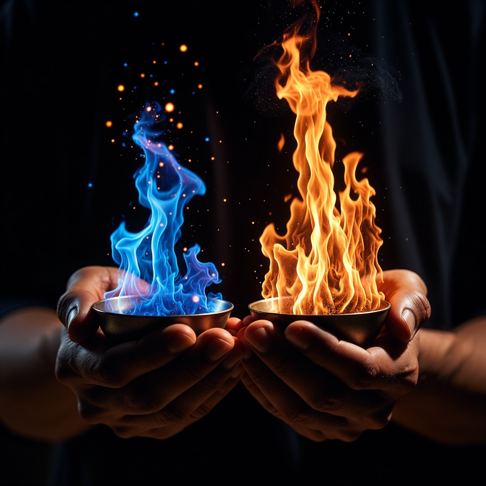 blue fire, blue flames, contrasting flames, dark background, dynamic flames, fiery hands, fire, fire bowls, fire elements, flames, golden bowls, holding fire, male, orange fire, orange flames, sparkling effects, hands