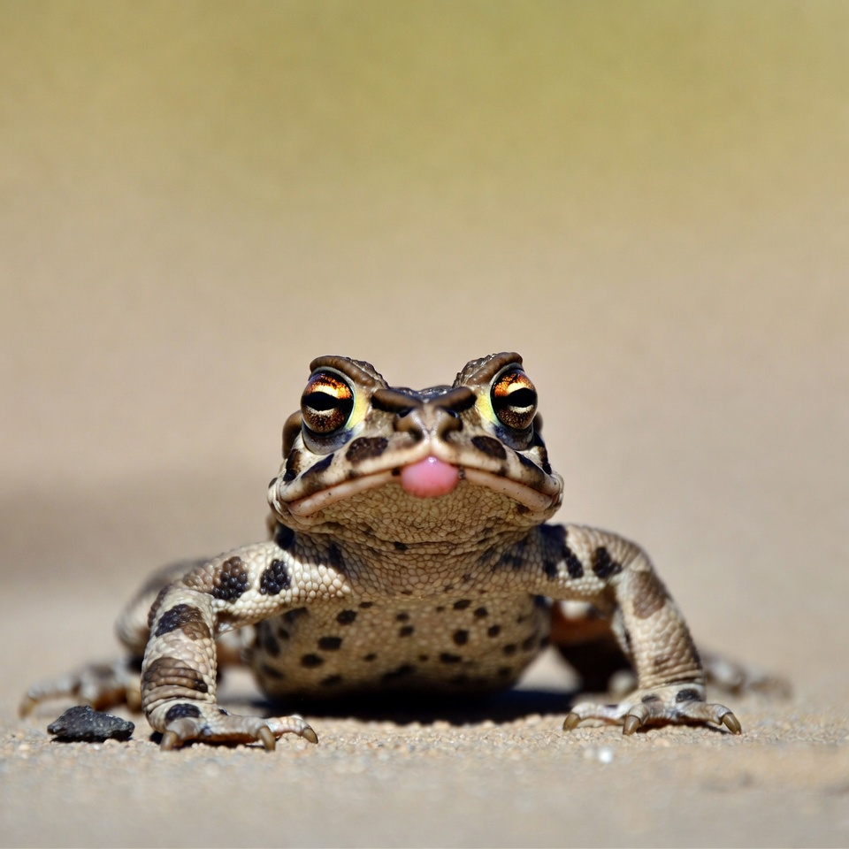 amphibian, animal, brown toad, closeup, frog, golden eyes, isolated background, macro, nature, sand ground, spotted toad, tongue out, wildlife, toad