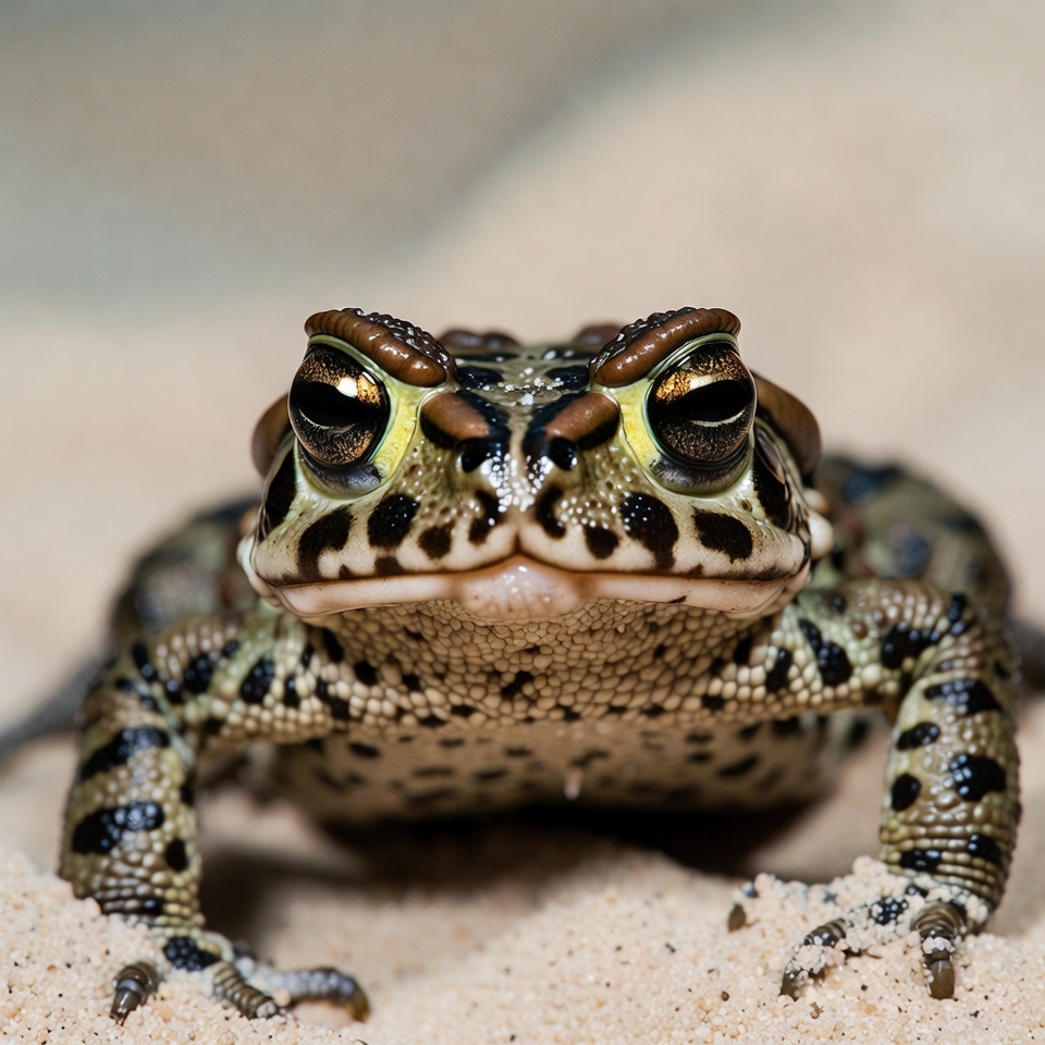 American toad, amphibian, animal, brown spots, close-up, frog, green skin, isolated background, legs, moist skin, nature, sand, wildlife, yellow eyes, toad