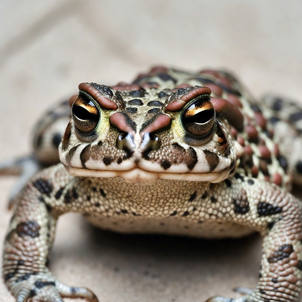 amphibian, animal, black spots, bumpy skin, close-up, detailed texture, frog, front view, golden eyes, macro, nature, reddish brown, spots, staring, tiled background, wildlife, toad