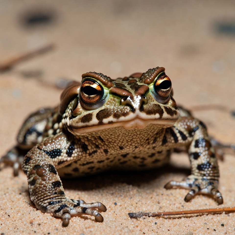 A toad with green and brown spotted skin sits on sandy ground. It has prominent golden eyes with black pupils and textured limbs. Small twigs and sand grains surround it.