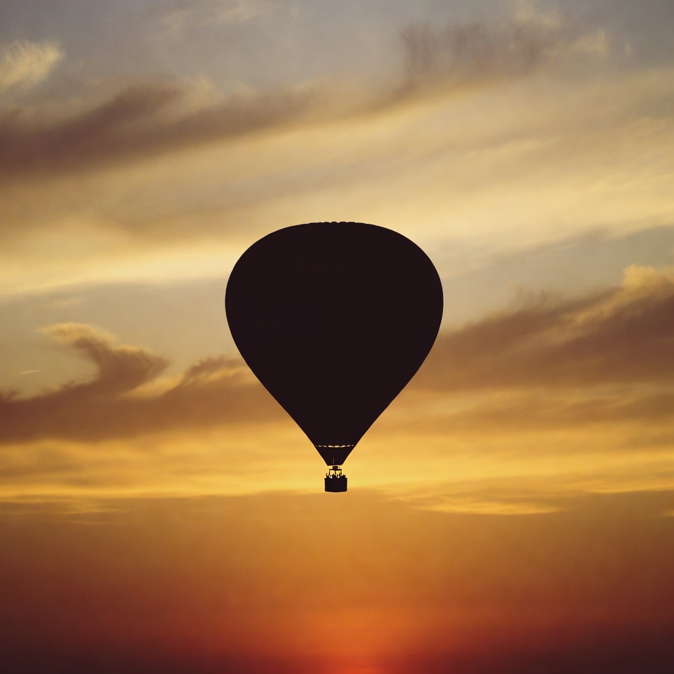 A large black silhouette of a hot air balloon floats against a vibrant sunset sky. The balloon is centered in the frame with its basket visible below. Orange and yellow clouds fill the background during golden hour.