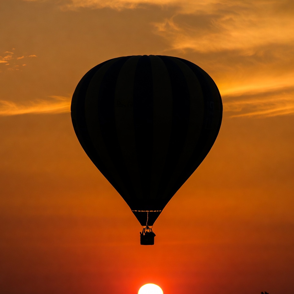 aerial, balloon, clouds, dark balloon, dusk, evening sky, floating balloon, golden hour, horizon, orange sky, silhouette, sky, striped balloon, sun, sunset, hot air balloon