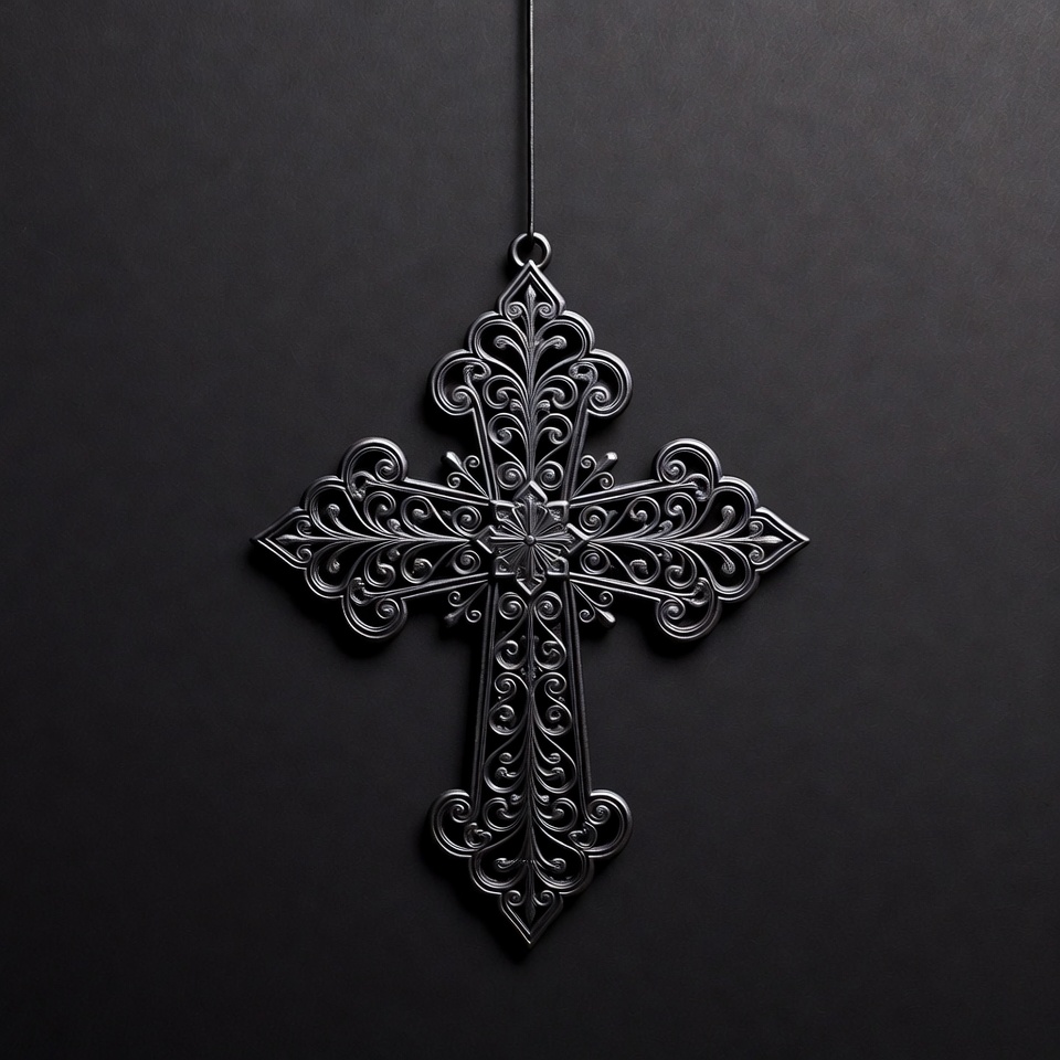 An intricate black metal cross with elaborate filigree designs hangs from a thin chain. It is suspended against a solid black background, showcasing its detailed ornate patterns and gothic style. The cross features symmetrical curls and flourishes on all arms.