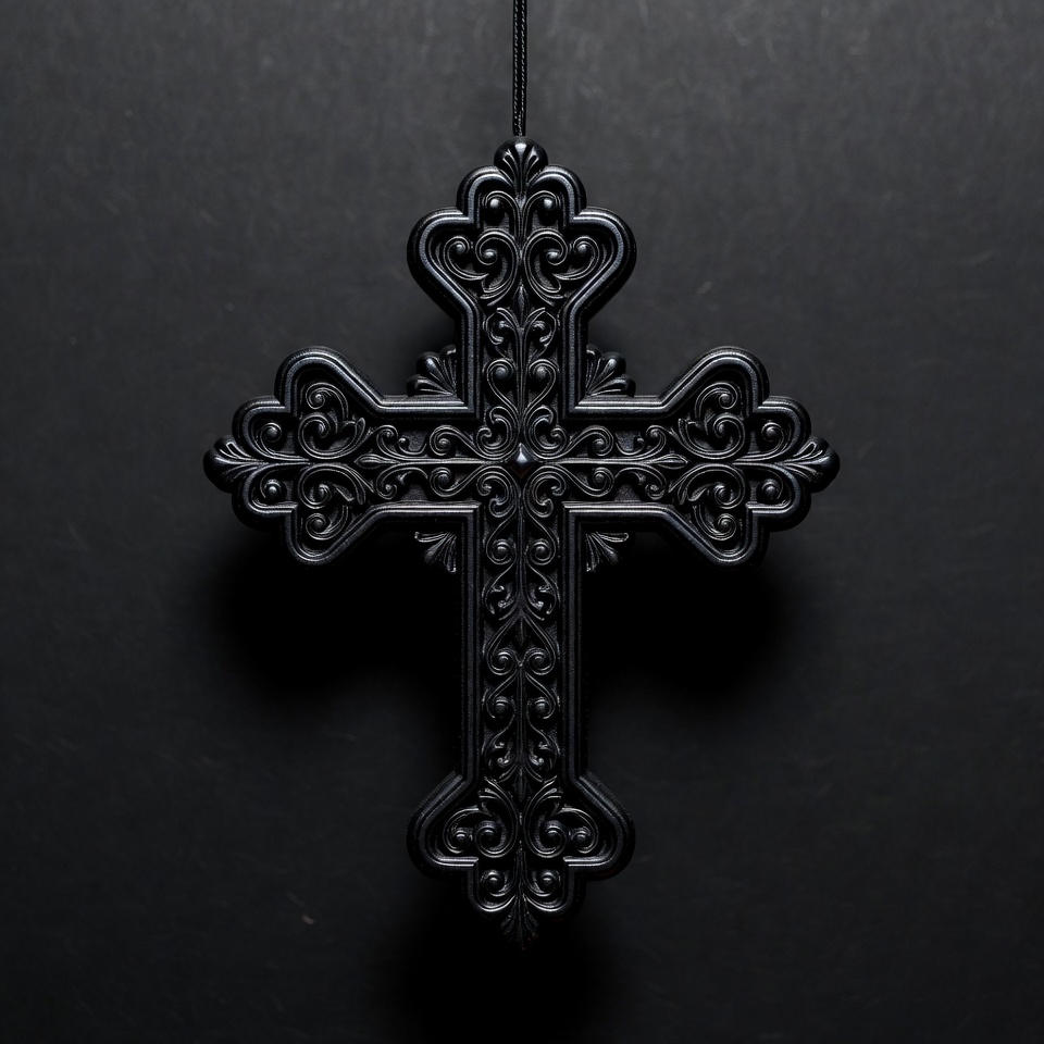 A black ornate cross hangs from a string against a dark background. It features intricate floral and filigree designs on all arms. The cross has a glossy finish and symmetrical decorative patterns.