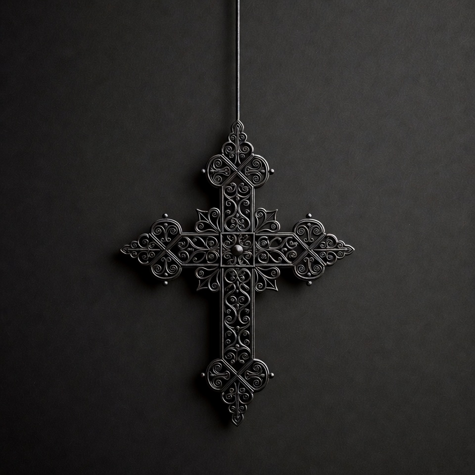 A detailed black metal cross with intricate filigree designs hangs from a chain against a dark background. The cross features elaborate scrollwork and floral patterns on all arms, centered with a small decorative element. It is rendered in a 3D style with subtle highlights.