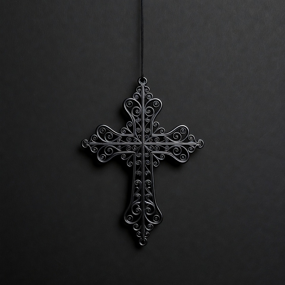 A black metal cross with intricate filigree designs hangs from a thin cord against a solid black background. The cross features elaborate swirling patterns on its arms and center. It is suspended centrally, creating a dramatic silhouette.