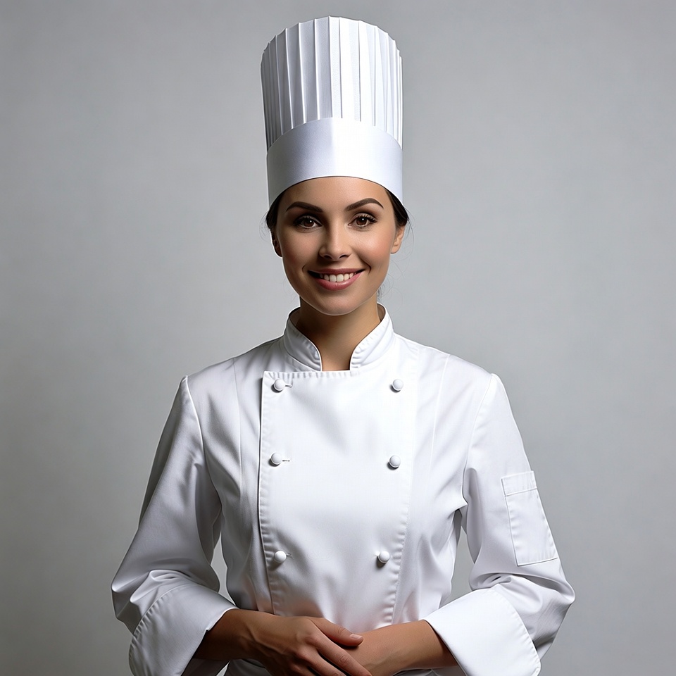 A smiling woman with dark hair wears a tall white chef's toque and double-breasted white chef jacket. She stands with hands clasped in front, posed confidently against a plain gray background. Her uniform features a high collar and sleeve cuffs.