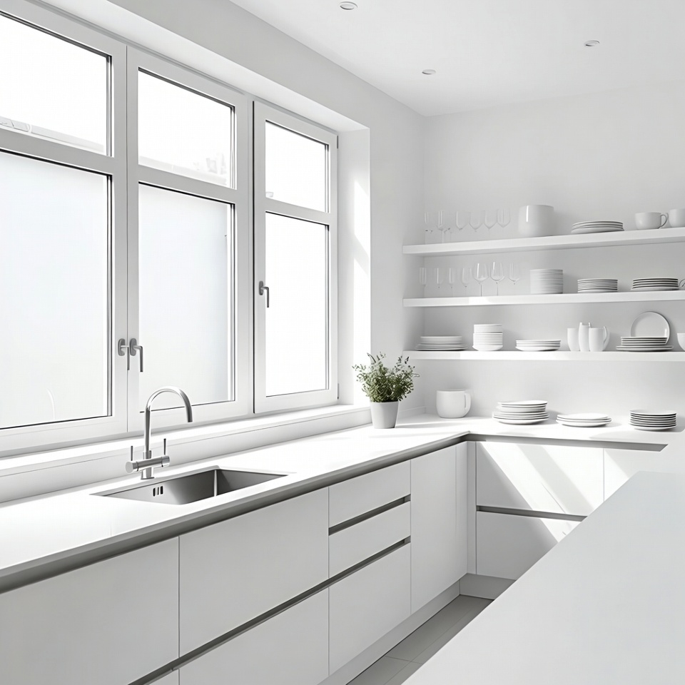 bright kitchen, clean kitchen, contemporary design, corner kitchen, countertops, frosted windows, glassware, glossy cabinets, green plant, handleless drawers, kitchen interior, kitchen shelves, kitchen sink, large windows, minimalist kitchen, modern kitchen, natural light, shelves, stainless sink, sunlight, white bowls, white cabinets, white dishes, white plates, white kitchen