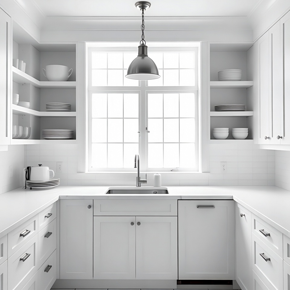A compact white kitchen features glossy white cabinets, open shelves with white plates and bowls, and a large window allowing natural light. A pendant lamp hangs above the white countertop with an undermount sink and dishwasher. The clean, minimalist design includes subway tile backsplash and wooden flooring.