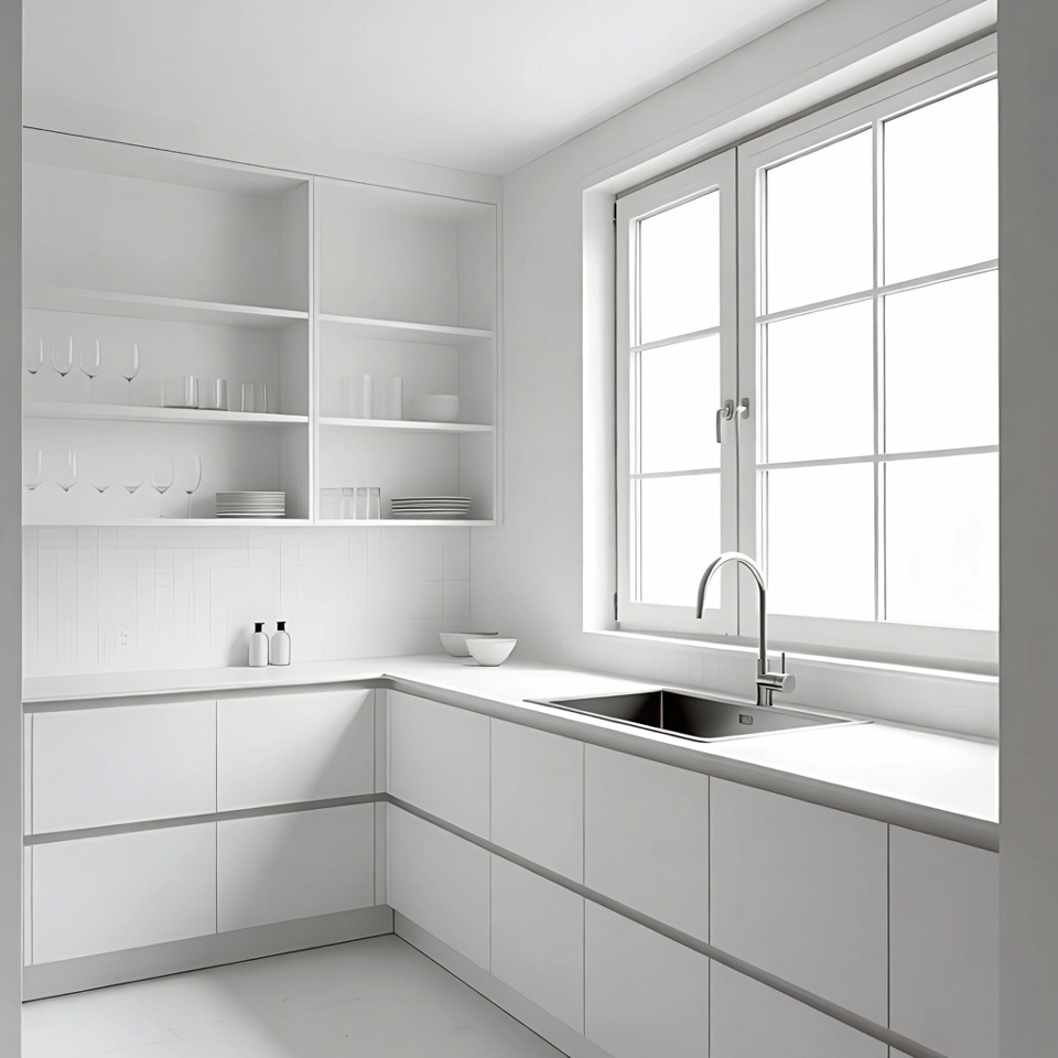 A minimalist white kitchen features sleek cabinets, open shelves with glasses and plates, and a stainless steel sink under a large window. The L-shaped countertops and glossy surfaces create a clean, contemporary look. Natural light floods the empty room from the window.