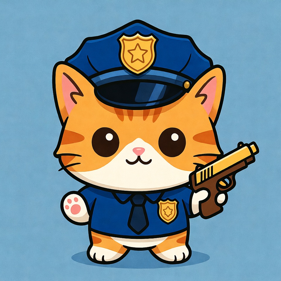 animal, cartoon cat, chibi style, clipart, cop uniform, cute cat, feline, handgun, holding gun, illustration, isolated background, kawaii, orange cat, police badge, police hat, tabby cat, police cat