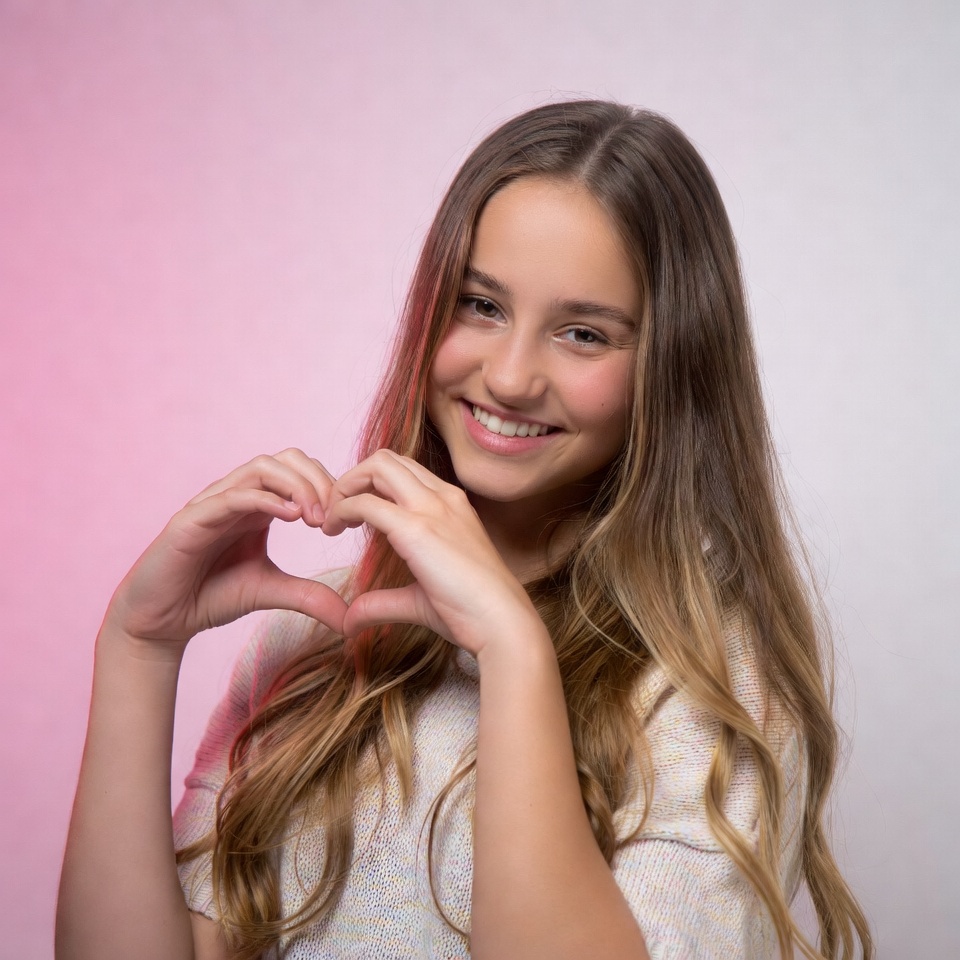 A teenage girl with long wavy brown hair smiles at the camera while forming a heart shape with her hands in front. She wears a light-colored sweater and stands against a pink gradient background. Her expression is joyful and engaging.