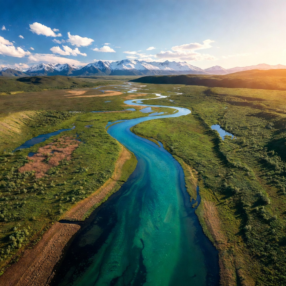 aerial view, alpine scenery, blue sky, clear water, clouds, drone photo, earthy tones, flowing water, golden hour, grassy banks, green meadows, landscape, lush greenery, mountain range, mountain valley, nature, outdoor nature, panoramic view, remote valley, river bend, scenic river, snow-capped mountains, summer landscape, sunlight, turquoise river, valley, wetlands, wilderness, river