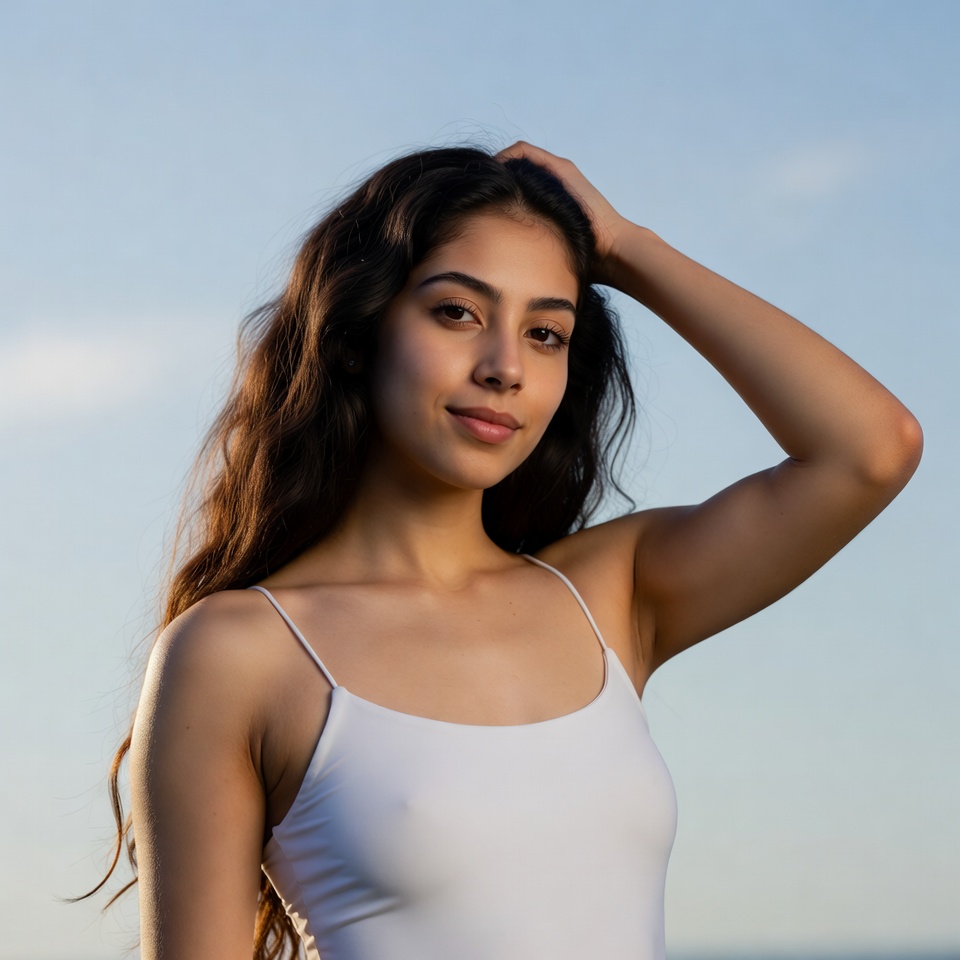 A young woman with long wavy brown hair stands against a blue sky background. She wears a white spaghetti strap top and poses with one hand on her head and her arm extended. She has a gentle smile and direct gaze at the camera.