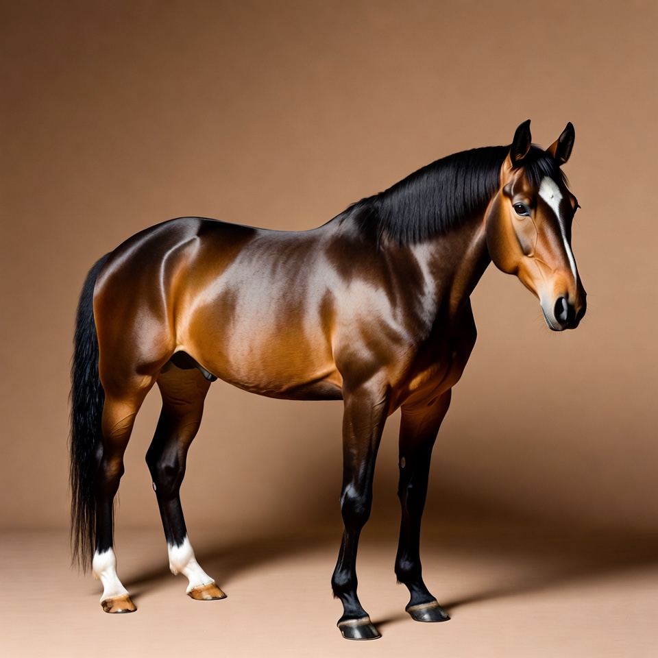 A majestic bay horse with a black mane and tail stands profile on a neutral beige background. It features a white blaze on its face, white socks on its hind legs, and glossy brown coat with black points. The horse poses elegantly with its head turned slightly.