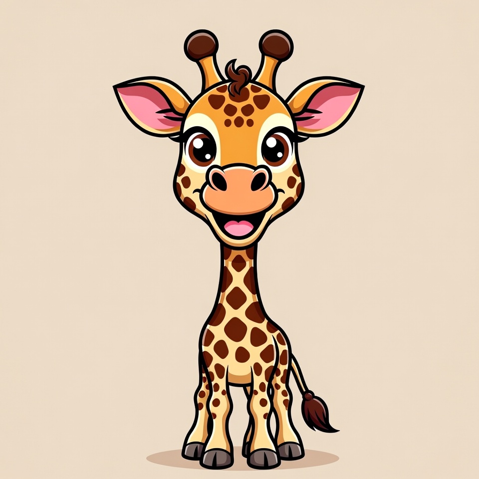 A cute cartoon baby giraffe stands on a plain beige background. It has large expressive eyes, pink inner ears, and a wide happy smile. The giraffe features brown spots on its orange body, small horns, and a short tail.