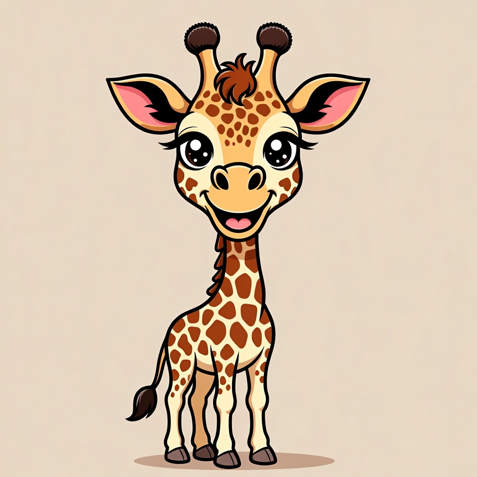 A kawaii-style cartoon illustration of a baby giraffe stands on a plain beige background. The giraffe features large sparkling eyes, a wide smiling mouth, pink inner ears, and brown ossicones with tufts. Its body is covered in orange spots with brown edges, and it has a short tail.