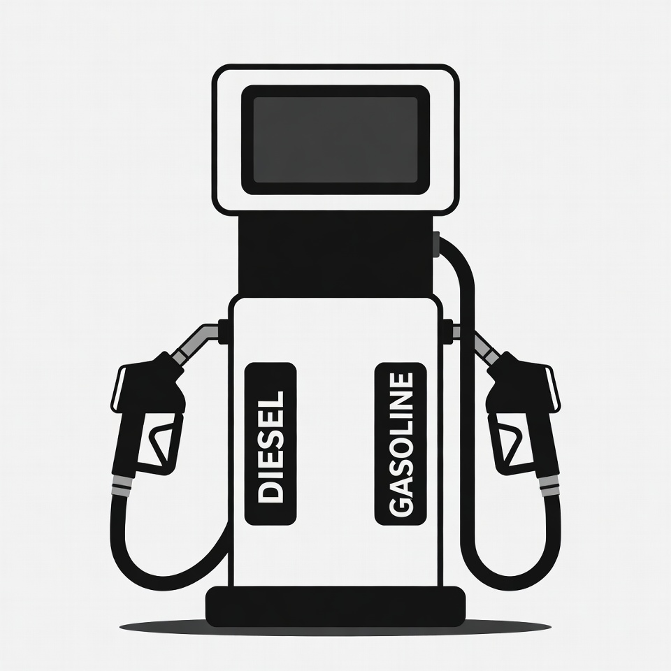 A simple black and white illustration of a gas station pump with diesel and gasoline labels. It features a screen on top, two hoses with nozzles, and black shadows beneath on a white background. The design is clean and vector-style.
