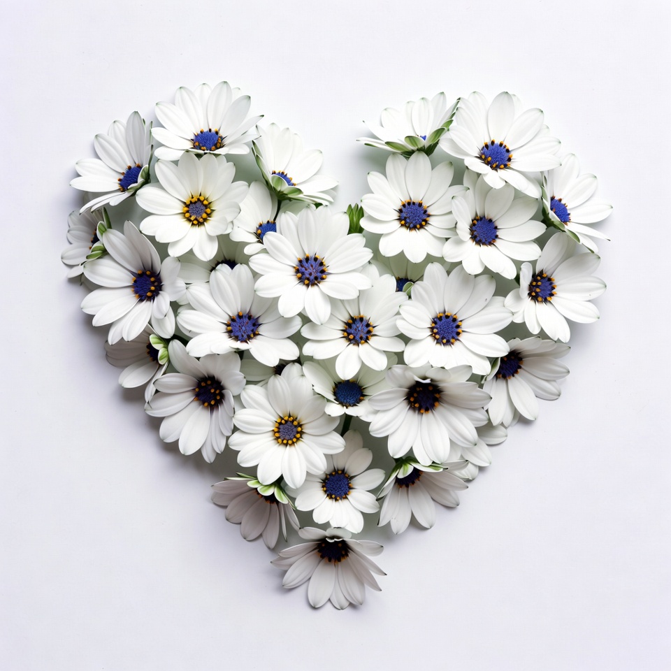 A heart shape is meticulously formed by numerous white daisies with vibrant blue centers. The flowers are arranged tightly together on a plain white background. Each daisy features delicate white petals surrounding a striking blue eye.
