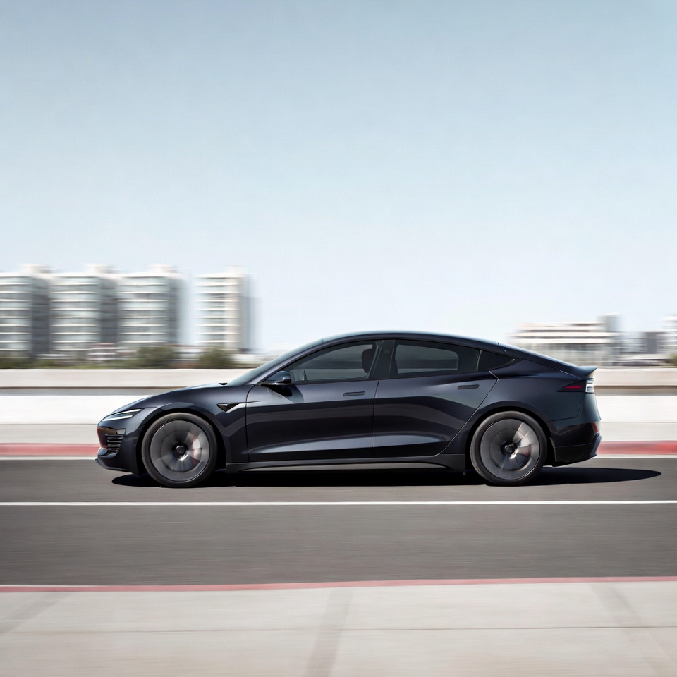 A sleek black Tesla Model S sedan drives at high speed on a highway with red lane markings. Blurred modern apartment buildings line the background under a clear sky. The car is captured from a side angle, showcasing its aerodynamic design and dark wheels.
