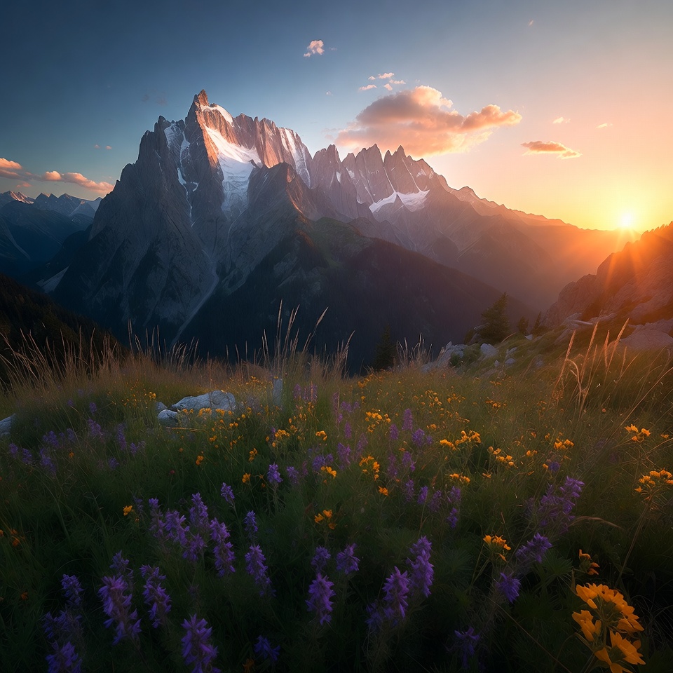 Majestic Mont Blanc mountain range glows in golden sunset light with snow-capped peaks and rugged ridges. A foreground meadow bursts with vibrant purple and yellow wildflowers amid tall grasses. Scattered clouds enhance the dramatic alpine landscape.