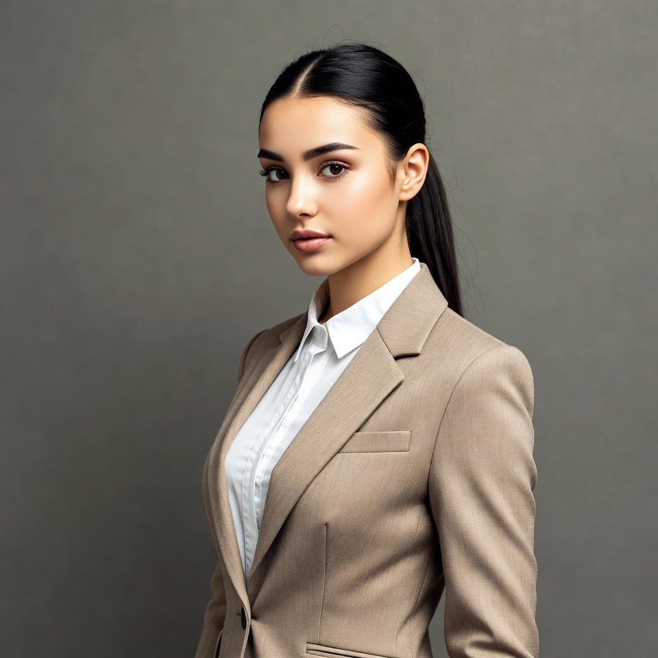 A young Asian woman with long black hair in a ponytail stands against a gray background. She wears a beige blazer suit with a white collared shirt and gazes directly at the camera. Her expression is neutral and professional.