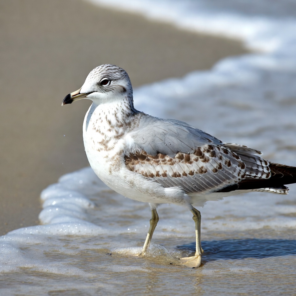 A seagull with gray and white feathers stands on a sandy beach near gentle ocean waves. Its yellow beak and legs are visible, and it faces the camera with a direct gaze. Foam from the waves laps at the sand around its feet.