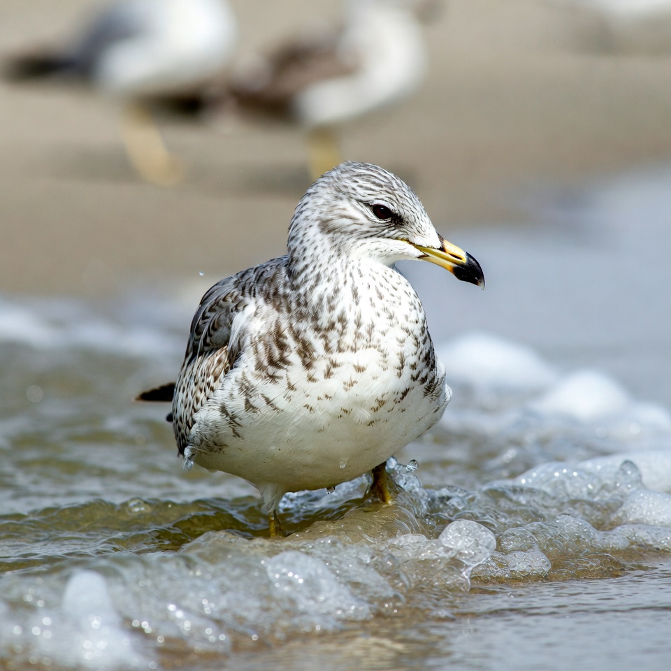 A juvenile gull with gray and white feathers stands in shallow ocean waves on a sandy beach. Several blurred gulls are visible in the background. Water droplets cling to its feathers and yellow legs.