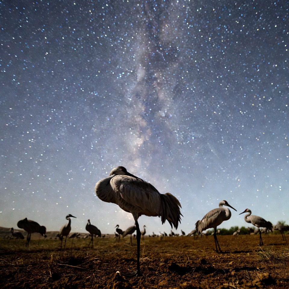 Milky Way, animals, astronomy, bird flock, birds, constellation, crane bird, dark sky, galaxy, grass field, nature, night sky, outdoor, silhouette, standing birds, stargazing, starry sky, stars, wildlife, cranes