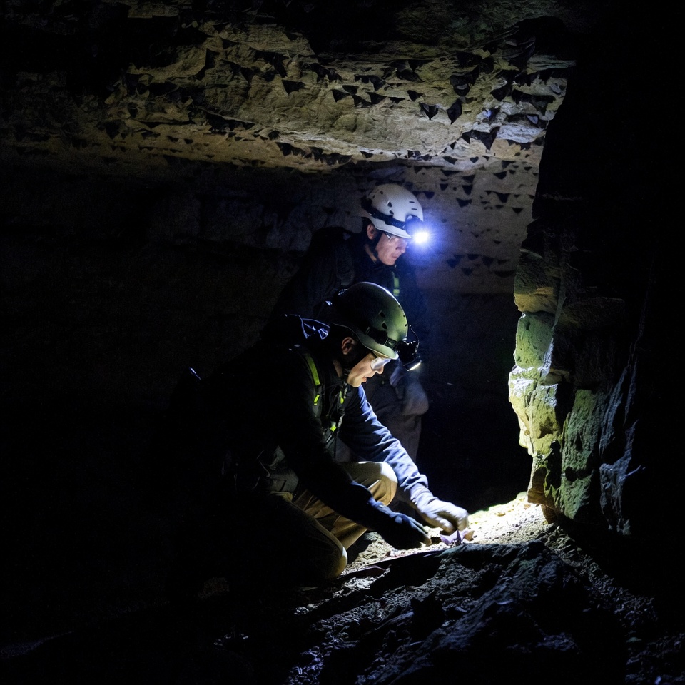 Two men wearing helmets with headlamps explore a narrow cave passage illuminated by their lights. One kneels to inspect rocks on the ground while the other stands nearby. They are dressed in jackets, pants, and gloves suitable for caving.