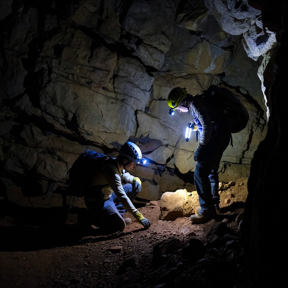 Two people in helmets with headlamps explore a dark cave interior. One stands holding a light while the other kneels examining rocks on the ground. They wear backpacks and rugged clothing amid rocky walls illuminated by flashlight beams.