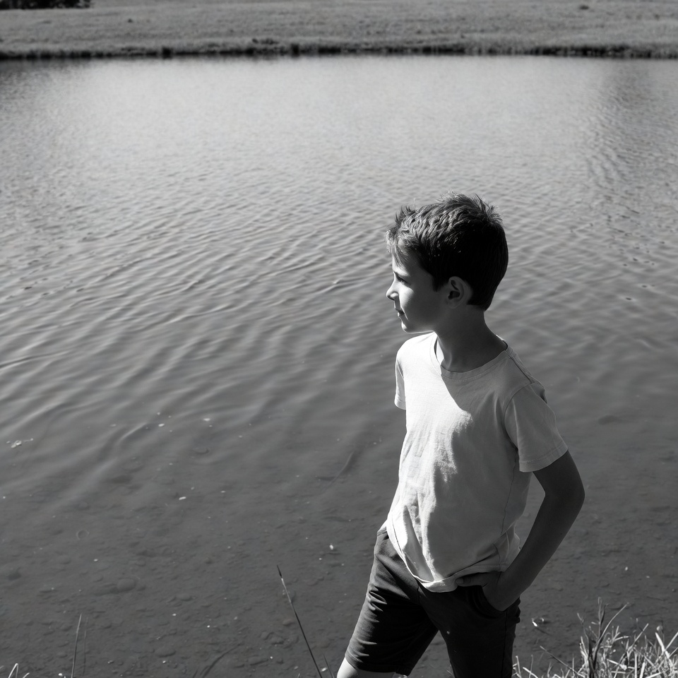 A young boy with short hair stands in profile by a calm lake, wearing a white t-shirt and dark shorts. He has his hands in his pockets and gazes toward the water. The scene is in black and white with grassy fields in the background.