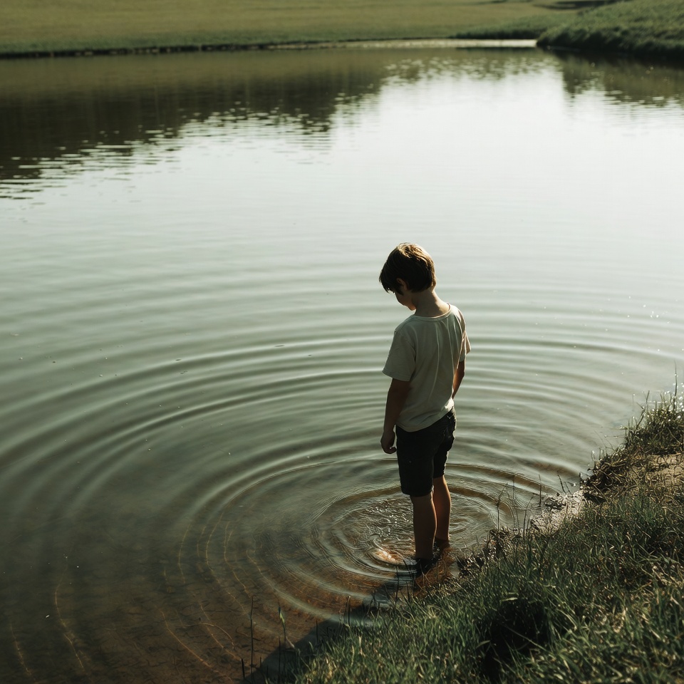 A young boy with short brown hair stands at the edge of a calm pond, dipping his bare feet into the shallow water and creating ripples. He wears a light-colored t-shirt and dark shorts, facing away from the camera. Lush green grass and reflections surround the serene waterside scene.