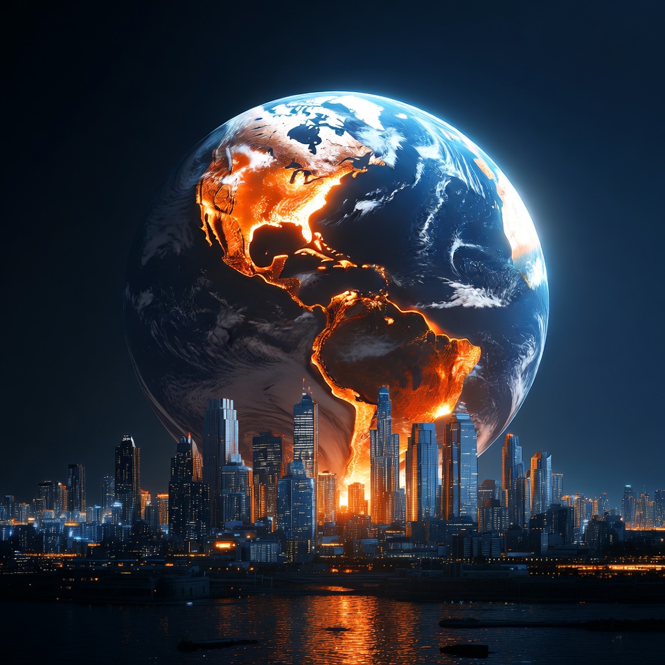 Americas, North America, South America, apocalypse, burning, city, cosmic, dark background, destruction, digital art, dramatic, fire, futuristic, globe, glowing, illustration, magma, neon lights, night, planet, reflection, sci-fi, skyline, skyscrapers, urban, water, Earth