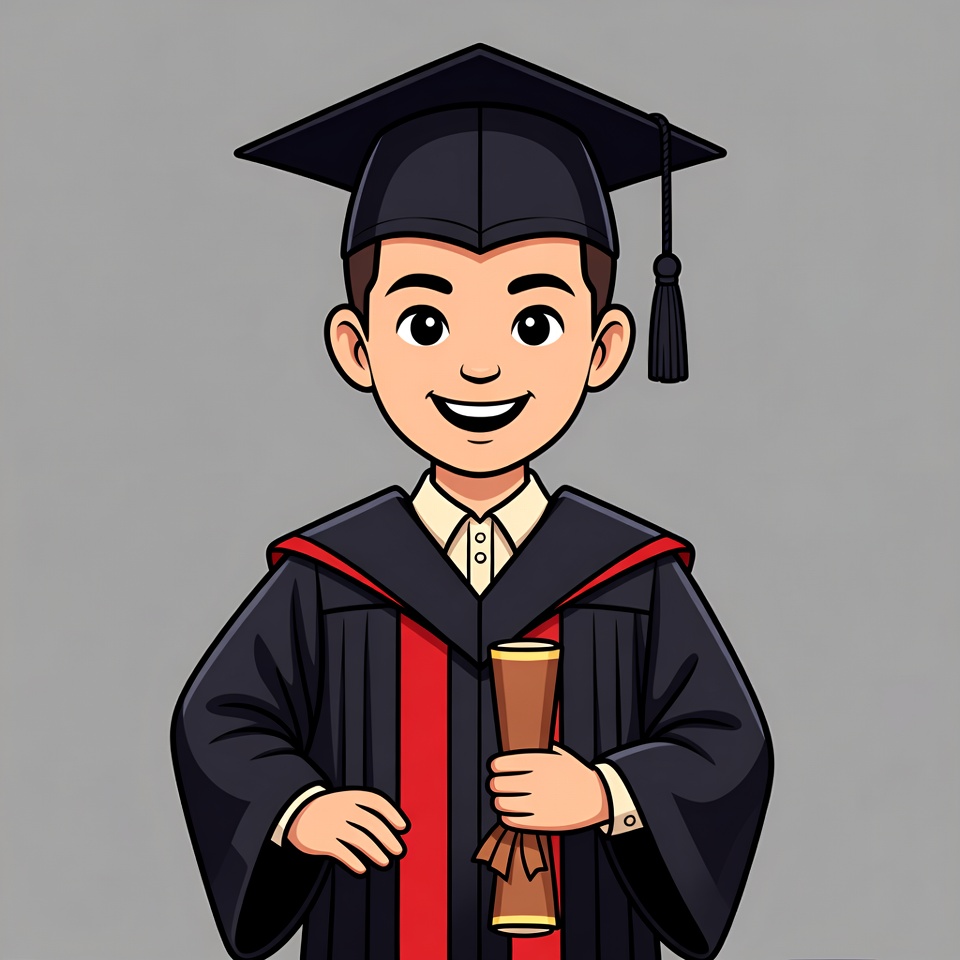 A cartoon boy with short brown hair smiles happily while wearing a black graduation cap and red-trimmed gown. He holds a rolled brown diploma in his right hand and stands with hands on hips. The illustration is set against a plain gray background.