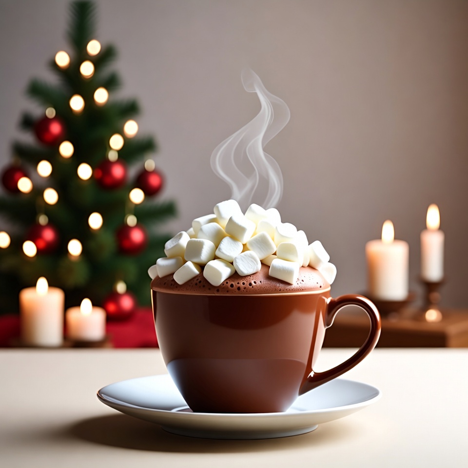 A large brown ceramic mug filled with steaming hot cocoa is topped with a generous pile of white marshmallows. It sits on a white saucer on a wooden table, with a blurred Christmas tree adorned with red ornaments and lights in the background. Two white candles and subtle red fabric add to the festive holiday scene.