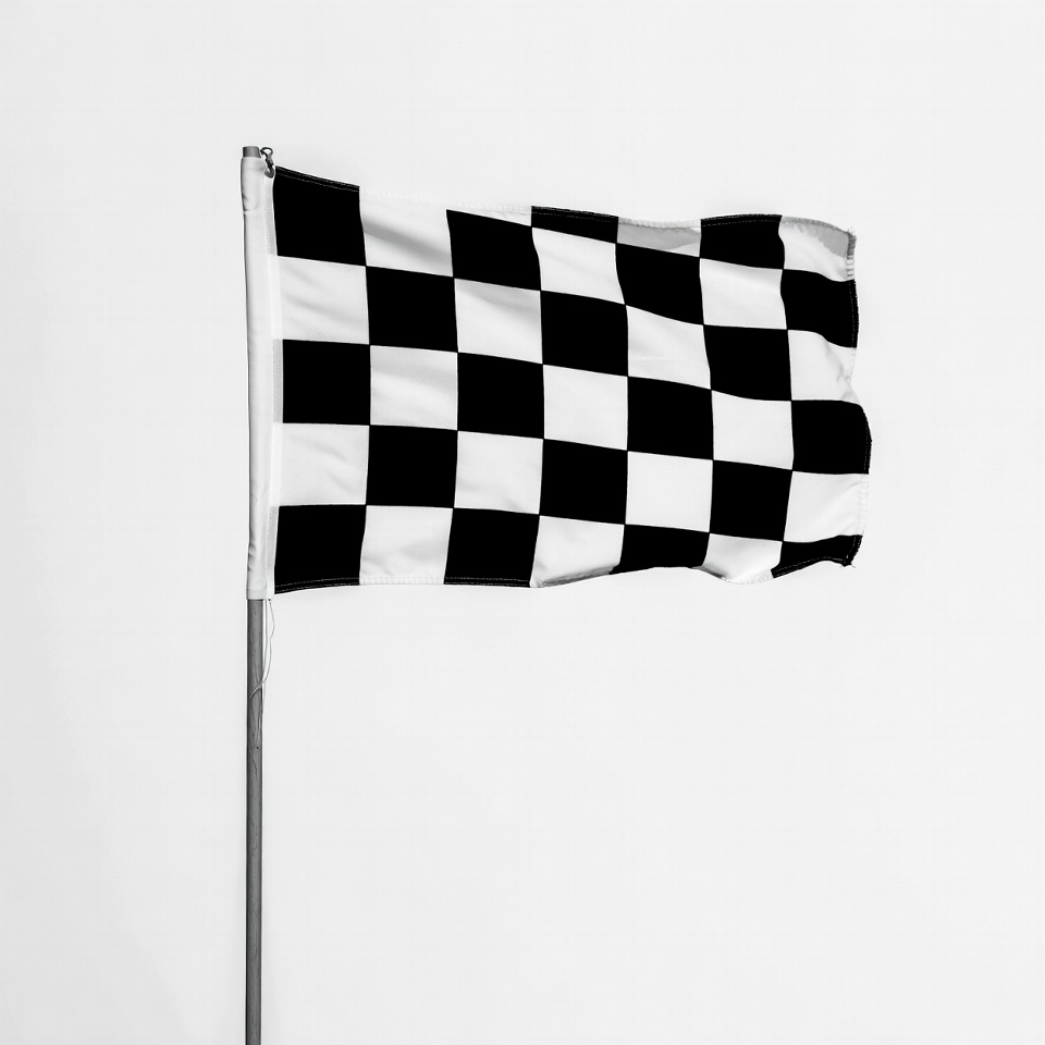 A black and white checkered racing flag waves gently from a metal pole. The flag features alternating black and white squares and is set against a plain white background. It is captured in a dynamic, slightly billowing position.