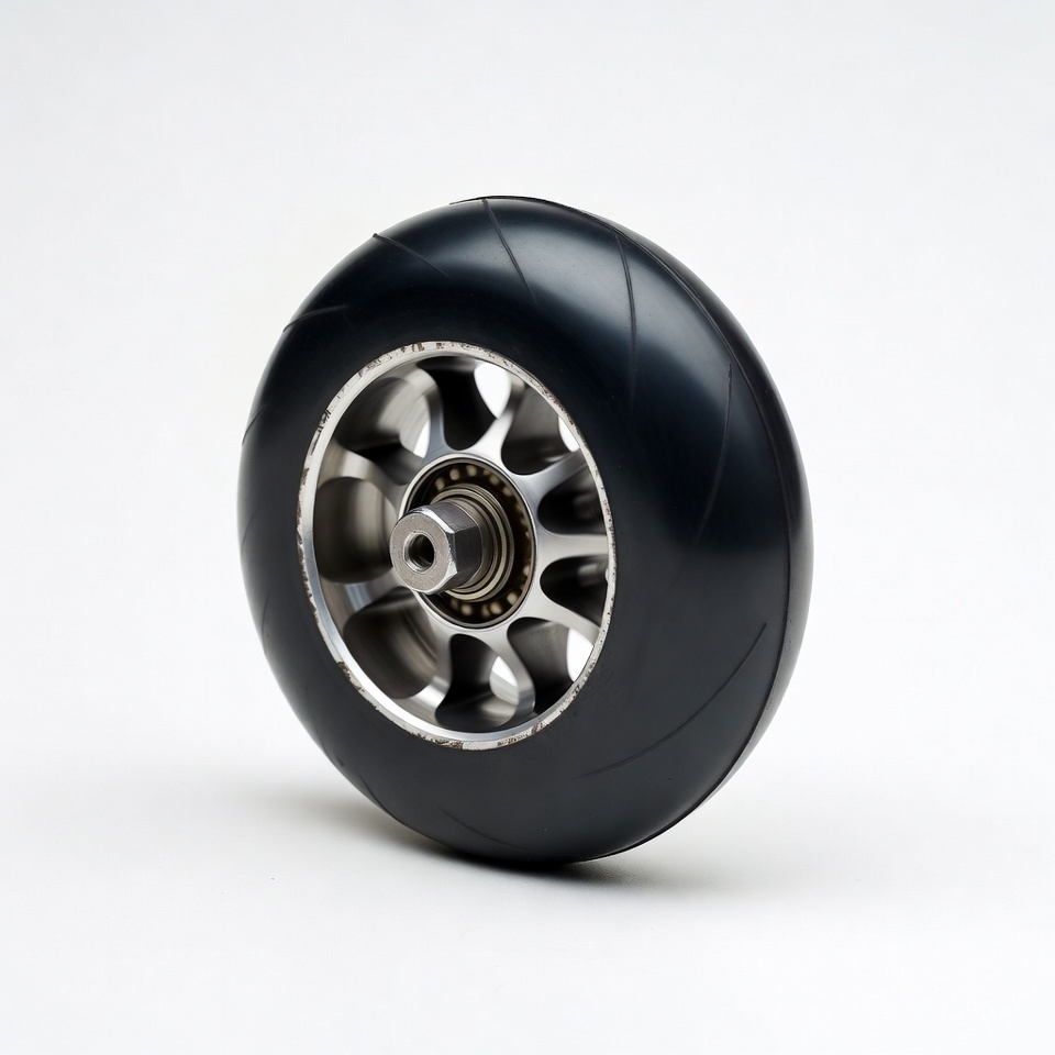RC wheel, alloy wheel, automotive part, axle, ball bearings, black tire, car wheel, drift wheel, high grip tire, isolated background, motorsport wheel, performance wheel, silver hub, slick tire, spokes, tire tread, wheel hub, racing wheel
