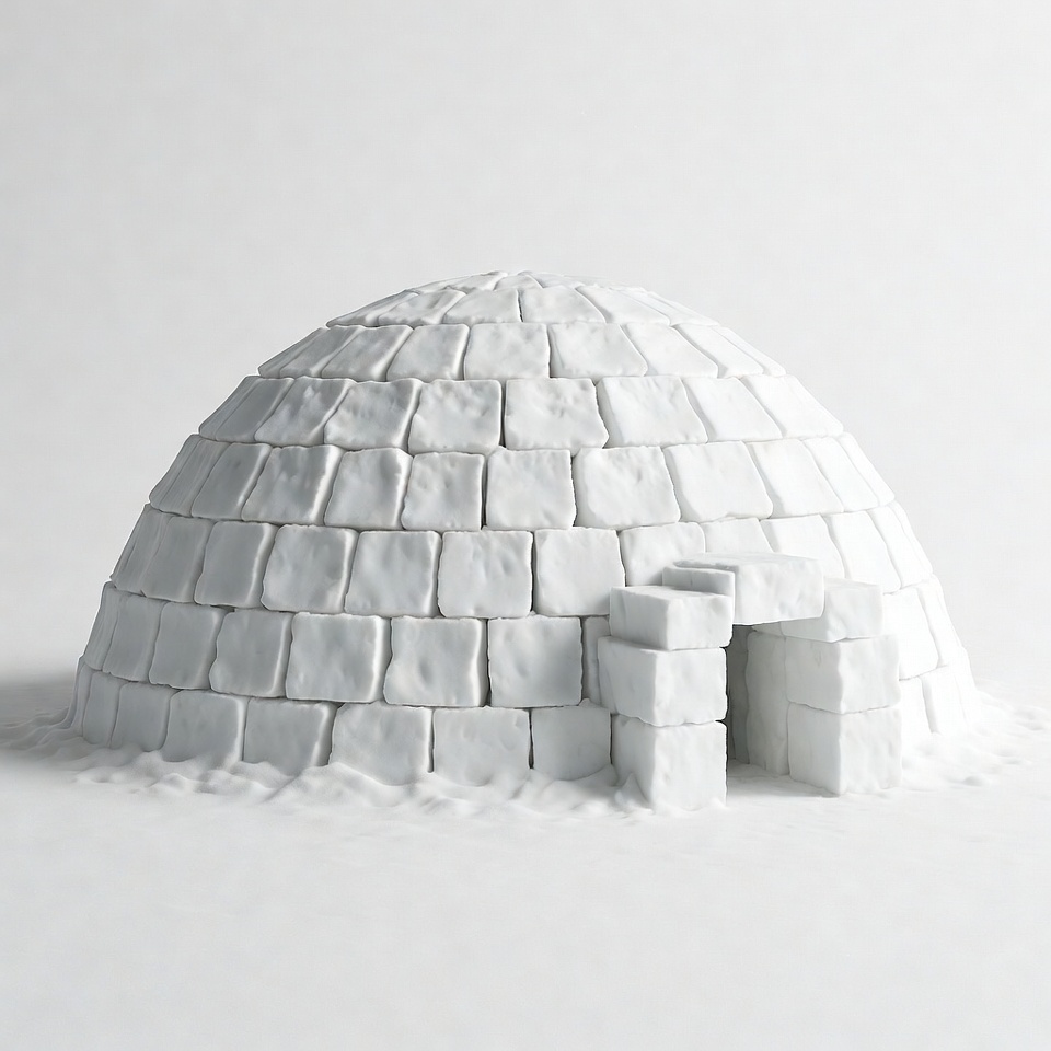 A detailed igloo made of snow blocks sits on a plain white background. The dome-shaped structure features a small arched entrance constructed from stacked white blocks. Snow dust surrounds the base, emphasizing its isolated presentation.