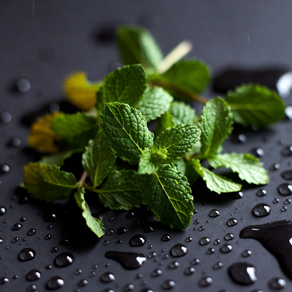 aromatic herb, black surface, closeup, dark background, dew drops, foliage, food photography, fresh mint, garnish, green leaves, herb, kitchen ingredient, macro shot, natural, peppermint, plant, serrated edges, spearmint, stems, textured leaves, water droplets, wet leaves, mint leaves