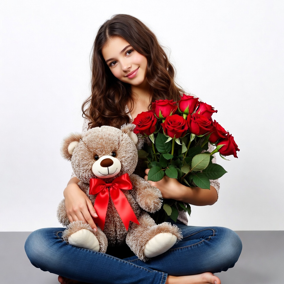 A young girl with long wavy brown hair sits on the floor holding a brown teddy bear with a red ribbon. She smiles happily while cradling a large bouquet of vibrant red roses in her other arm. Both the teddy bear and roses are positioned against a plain white background.